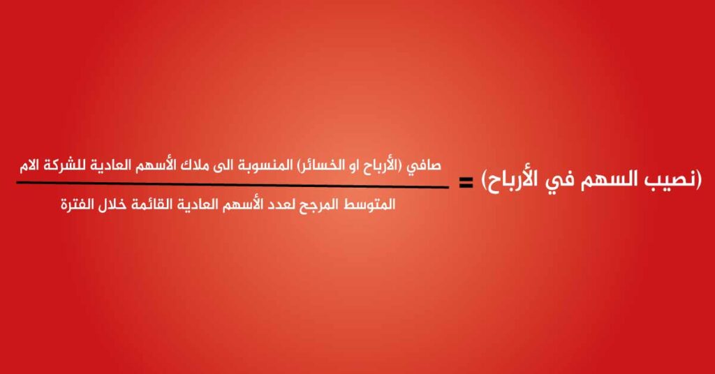 ويتم حسابة = بقسمة صافي (الأرباح او الخسائر) المنسوبة الى ملاك الأسهم العادية للشركة الام. (البسط) على. / المتوسط المرجح لعدد الأسهم العادية القائمة خلال الفترة. (المقام).